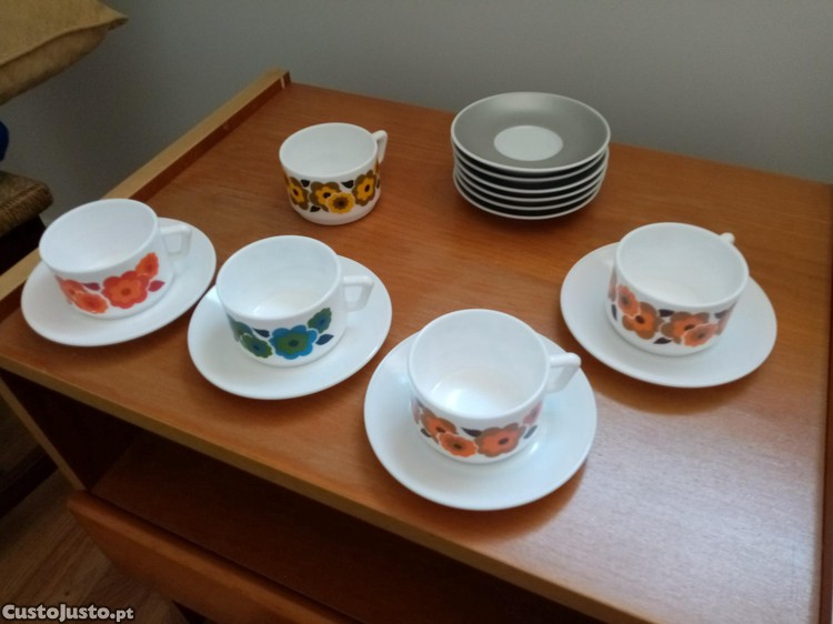 Vendo conjunto de 5 chávenas vintage (uma sem pires) da marca Arcopal France e 6 pires da marca Ema (Vista Alegre), estimadas e em bom estado.