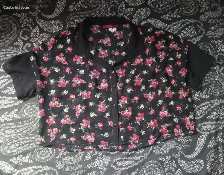 Blusa com rosas, tamanho M. Serve bem a S também. Com transparência.