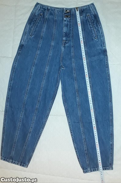 Vendo calças de ganga para senhora, sem cós, com dois botões e fecho-éclair