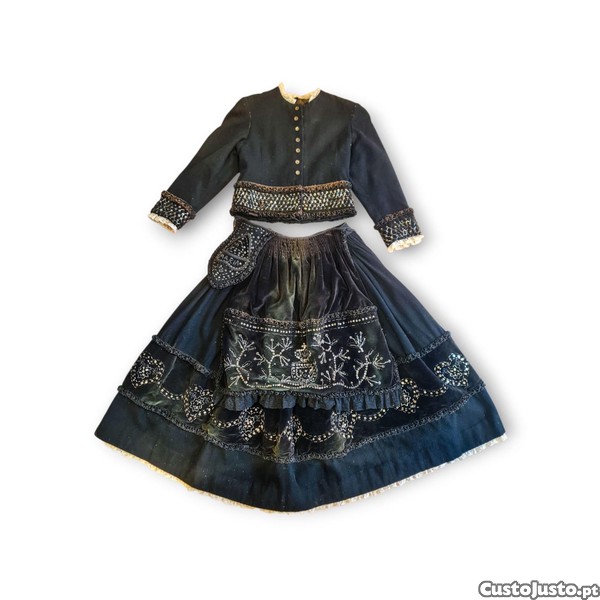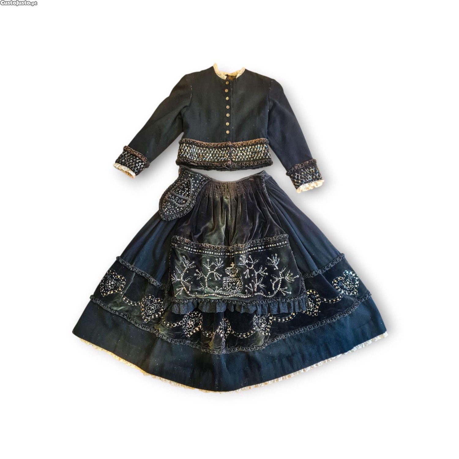 Conjunto antigo e completo do traje de noiva/mordoma em versão infantil, trabalhado à mão com vidrilhos e lantejoulas. Inclui casaco curto, saia rodada, avental bordado e algibeira em coração com o nome Maria . Ideal para coleção, exposição etnográfica ou para restauro/uso em recriações históricas.