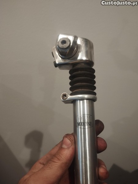 Espigão de selim com suspensão, em alumínio. Tem ajuste