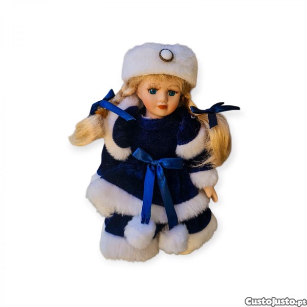 Delicada boneca de porcelana, estilo russo tradicional, vestida com traje de inverno azul profundo e detalhes em branco, incluindo gorro felpudo decorado com aplicação central. Os cabelos loiros estão cuidadosamente entrançados e enfeitados com laços de cetim azul. Peça de coleção ou decoração, esta boneca possui rosto pintado à mão e vestido em tecido de veludo sintético, com acabamento detalhado.