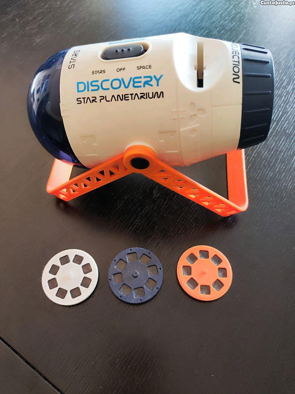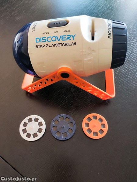 Projetor de estrelas, com rotação automática e ainda projetor de imagens de planetas. Vai com os 3 discos de projecção originais e funciona a pilhas.