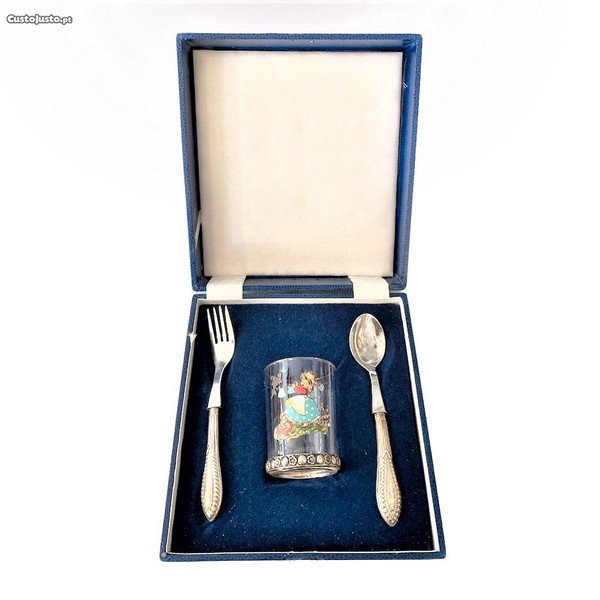 Preço: 35 €Caixa Azul Talheres Infantil Prata Copo c/Acabamentos Prata