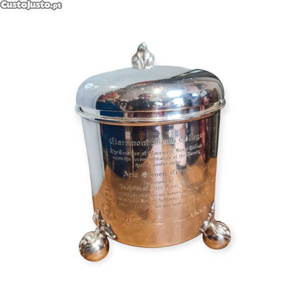 Peça rara e refinada da prestigiada Tiffany & Co., inteiramente em prata sterling (925), com marcação STERLING DENMARK . Design robusto com três pés esféricos ornamentados, tampa articulada com dobradiça trabalhada e inscrição comemorativa do Claremont McKenna College, Califórnia. Peça provavelmente atribuída a uma formatura de prestígio. Ideal para colecionadores, antiquários ou como peça de destaque em decoração clássica.