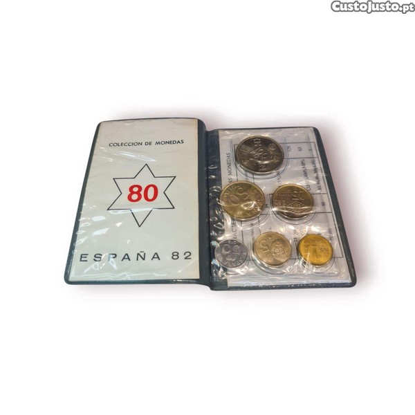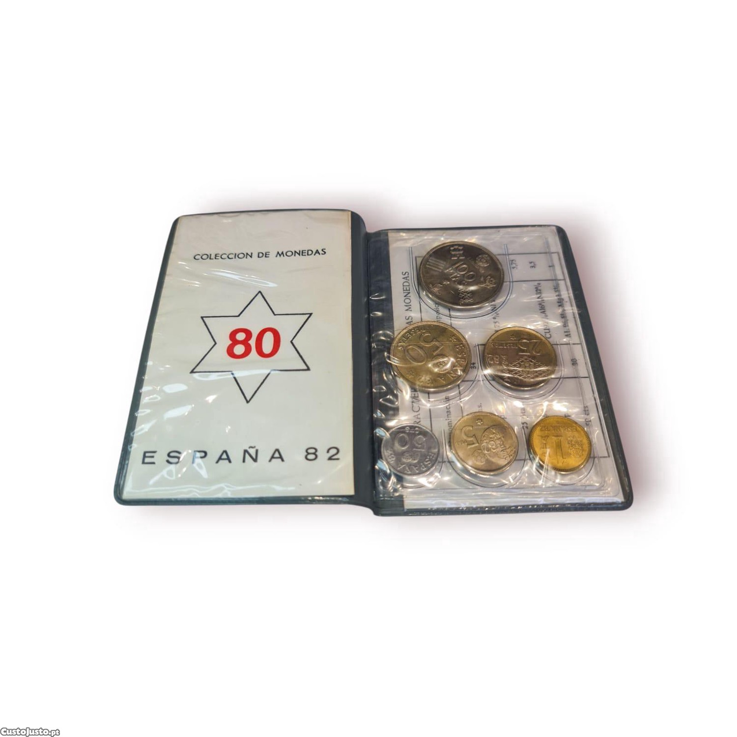 Carteira comemorativa do Mundial de Futebol de 1982 (Espanha), com as 6 denominações da peseta: 50 cts, 1, 5, 25, 50 e 100 pesetas (c. 1980 82, estrella conforme emissão). Ideal para iniciantes em numismática, fãs de futebol e colecionadores de memorabilia do Mundial 82.