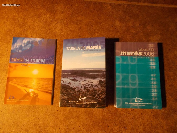 3 tabelas de marés do porto de Viana do Castelo de 2004,2005 e 2006 com calendário
