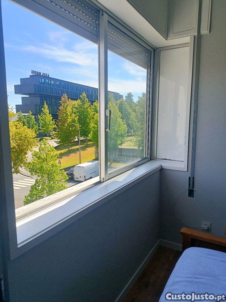 Quartos com cama, roupeiro, secretária, mesa de cabeceira.