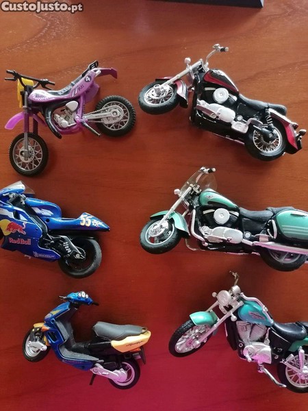 39 miniaturas de vários tipos de motos (clássicas, estrada, TT, scoters... ).