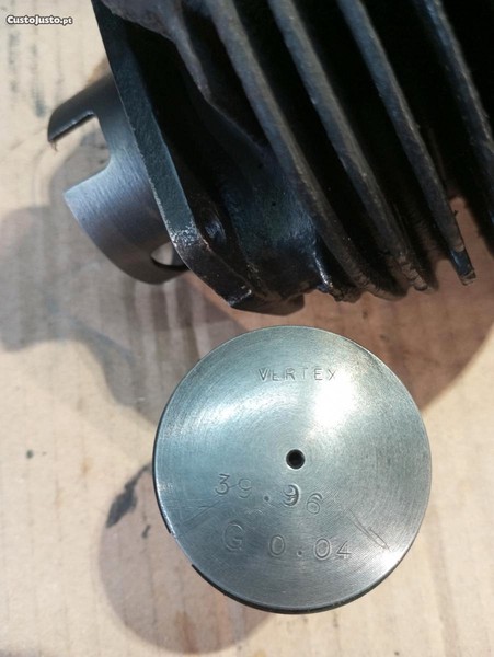 Cilindro e pistão completo e em bom estado para saxonette ou sachs minor, pistão marca vertex medida 39,96 G 0.04. Dá para 1 modelo só de acelerar e segundo modelo com caixa de duas velocidades automática (modelos dos anos 70)140