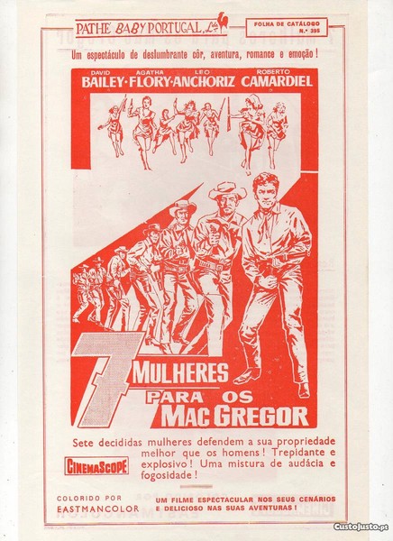 30x20 cm. Folheto de duas páginas. Antiga folha de sala/folha de catálogo da Pathé Baby Portugal. Cinema. "Sete mulheres para os MacGregor", um filme com David Bailey, Agatha Flory, Leo Anchoriz e Roberto Camardiel.
