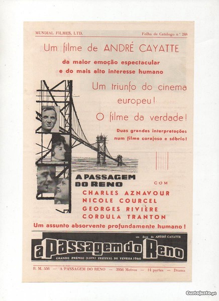 26x19 cm. Folheto de duas páginas. Antiga folha de sala/folha de catálogo da Mundial Filmes. Cinema. "A passagem do Reno", um folme de André Cayatte, com Charles Aznavour. Visado pela Censura.