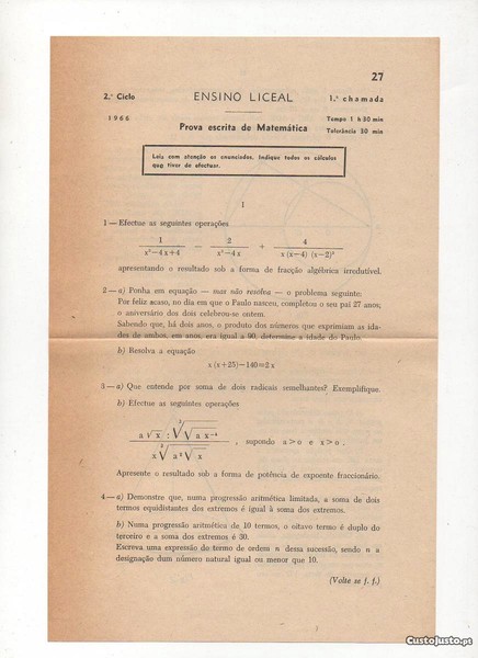 27x18 cm. Folheto de 2 páginas. Ensino Liceal. Prova escrita de Matemática.