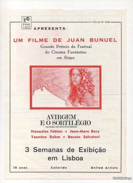 27x19 cm. Folheto de duas páginas. Antiga folha de sala/folha de catálogo da Rank Filmes de Portugal. Cinema. "A virgem e o sortilégio", um filme de Juan Luis Buñuel. Visado pela Censura.