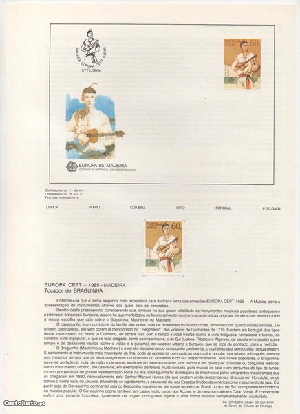 Madeira: tocador de Braguinha. 1985. Pagela dos CTT + selos + bloco + sobrescrito de primeiro dia. FDC. Filatelia.