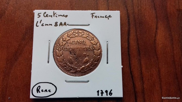Moeda 5 Centimes França L'an 8AA 1796 , moeda rara