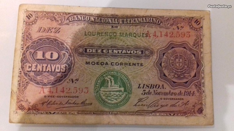 Nota de 10 centavos de 1914 de Moçambique, Lourenço Marques, rara