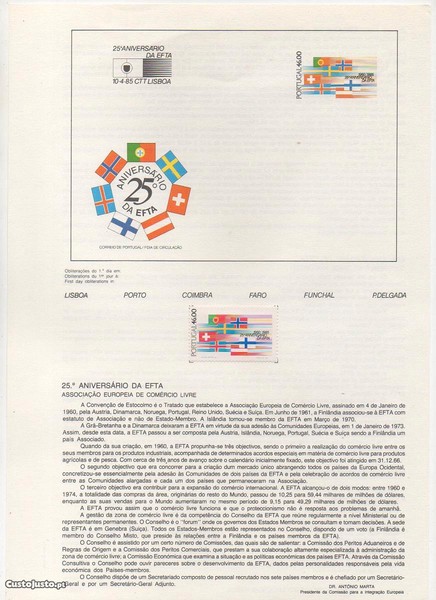 25 aniversário da EFTA. 1985. Pagela dos CTT + selo. Filatelia.