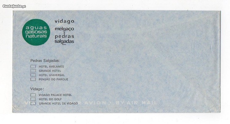 Vidago & Pedras Salgadas - envelope antigo 22x11 cm. Antigo envelope comercial da Vidago, Melgaço & Pedras Salgadas. Hotel Avelames, Grande Hotel, Hotel Universal, Pensão do Parque, Vidago Palace Hotel, Hotel do Golf e Grande Hotel de Vidago. C. 1970. 7 EUR (já inclui portes de correio e envio em envelope almofadado). Artigo sujeito a um desconto de 2 euros em compras conjuntas. 1P862