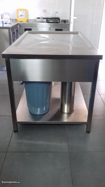 Mesa em aço inox 1,50x0,90x0,90, para enchidos com furo ao centro