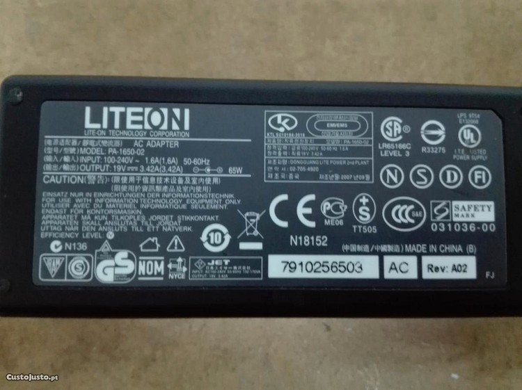 Transformador Acer PA-1650-02 usado, em bom estado, testado e a funcionar a 100% com as seguintes características: