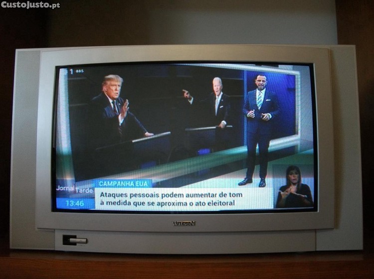 Televisor a cores cinzento modelo Watson FA2803 TS da marca Watson (11 AK 37). Ecrã de formato 16:9 com diagonal de 28'' (71 cm) mas como as colunas de som laterais tem 80 cm de largura. Tem um comando à distância mas não é o original (que desapareceu e ninguém deu conta) pelo que foi substituído por este similar (não é um comando universal, mas substitui o original sem ser necessário programá-lo). O controlo remoto está NOVO funciona com um par de pilhas tipo AAA (não incluídas).