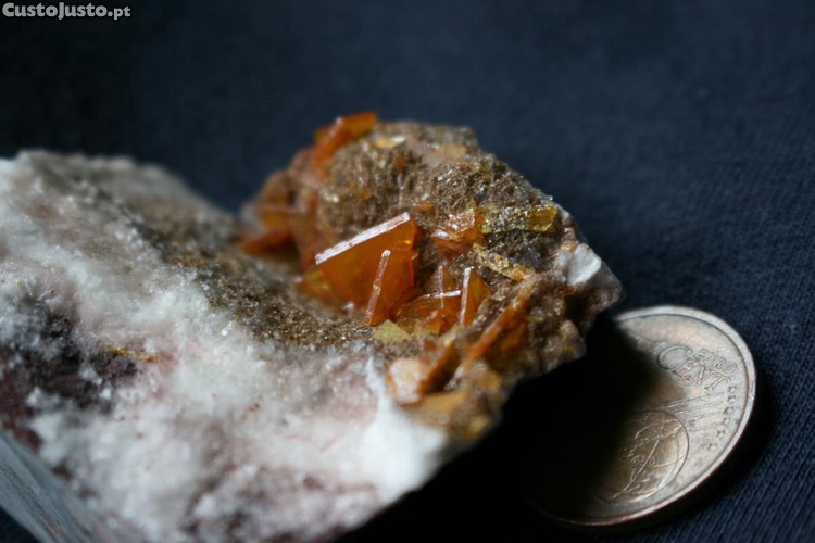 Amostra com cristais de wulfenite (cor de laranja) e descloizite sobre calcite (cor branca), proveniente das montanhas de Los Lamentos (Erupción Mine), Chihuahua, México. A amostra tem cerca de 4 cm por 4,5 cm de base e cerca de 2 cm de altura.