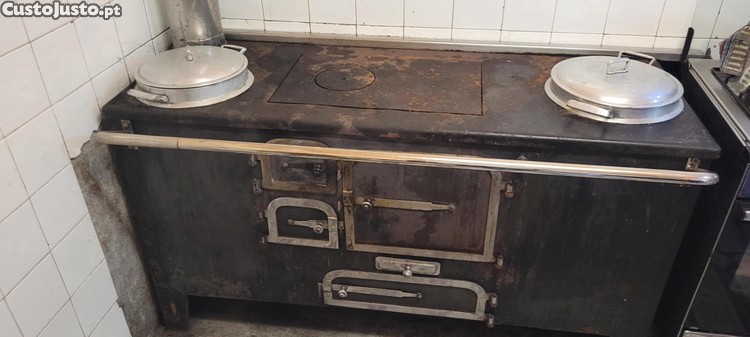 Fogão a lenha em muito bom estado, com dimensões generosas, com 2 panelas embutidas