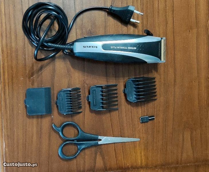 Máquina de cortar cabelo Taurus Titanium Plus, com fio, pente número 2, 3 e 4 + tesoura incluída, artigo usado mas a funcionar em perfeitas condições.