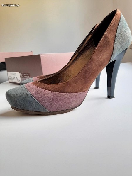 Sapatos de salto meia pata, três cores, lilás, azul e castanho, em pele genuína, camurça. Elegantes, têm um bonito salto em verniz. Número 39.