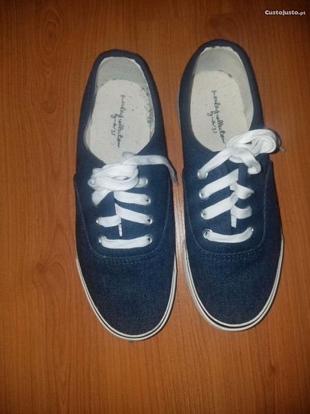 Ténis em tecido denim (jeans), número 37 (grande, calça 38).