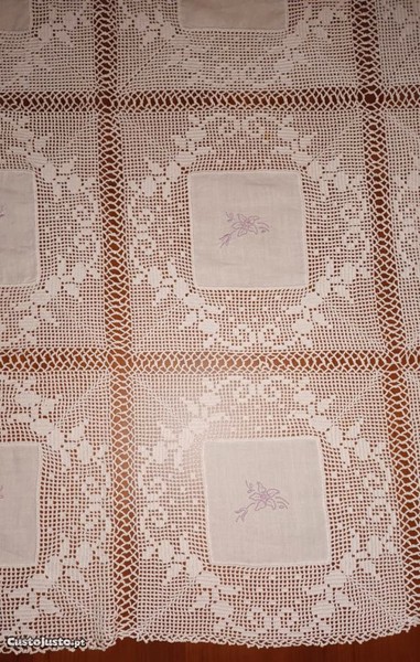Toalha quadrangular feita à mão com linho antigo, renda (linha 12) e bordada.