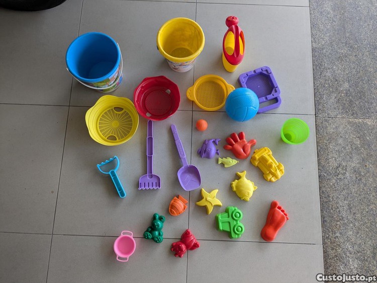 2 baldes, 1 regador, 4 peneiras, 2 ancinhos, 1 pá, 2 bolas e diversos outros brinquedos para fazer formas na areia.