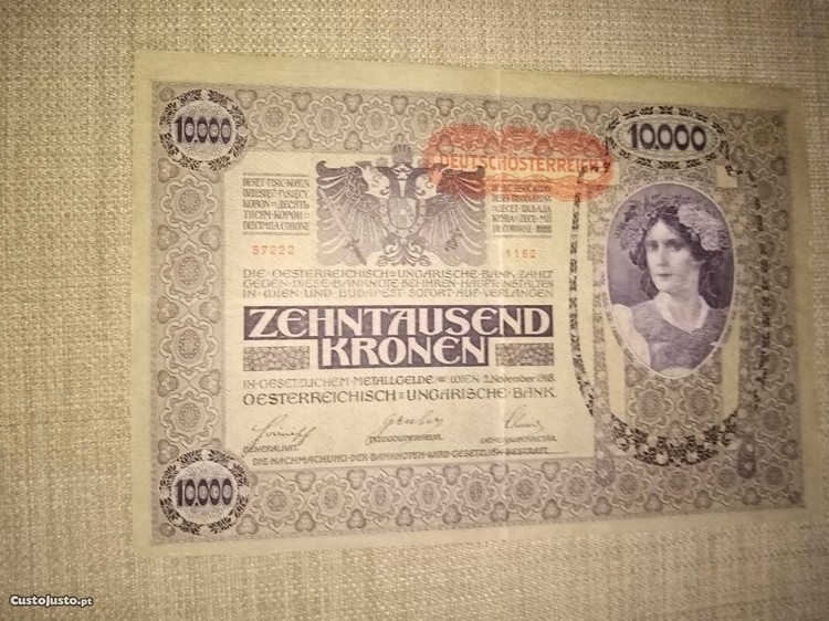 AUSTRIA, 1 Nota de 10 000 Kronen de 2 de Novembro de 1918 com o N 57222 Áustria Ocupada pela Alemanha com recarga de DEUTSHÖSTERREICH do fim da Primeira Guerra Mundial em bom estado de conservação, conforme fotos. Os portes são por conta do comprador mas posso entregar em mão em TAROUCA. Veja os meus outros anúncios.