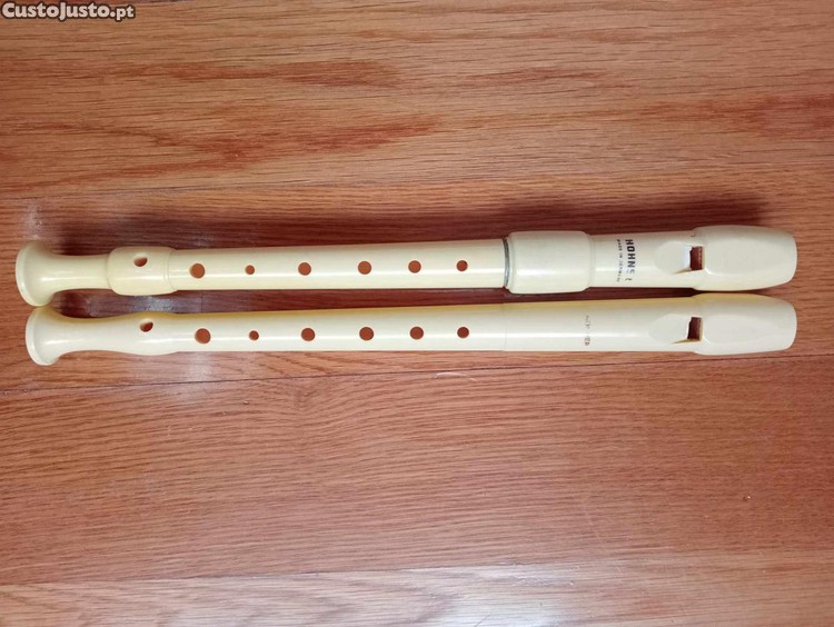 Conjunto de 2 Flautas de Bisel, da marca Hohner (Made in Germany). Foram utilizadas várias vezes, pelo que precisam de ser limpas/desinfetadas, por alguém que o saiba fazer corretamente. Apresentam sinais óbvios de utilização e desgaste. Ainda assim, servirão perfeitamente para as típicas aulas de música, do 2. ciclo (Portugal).