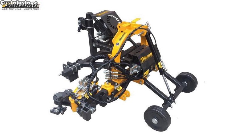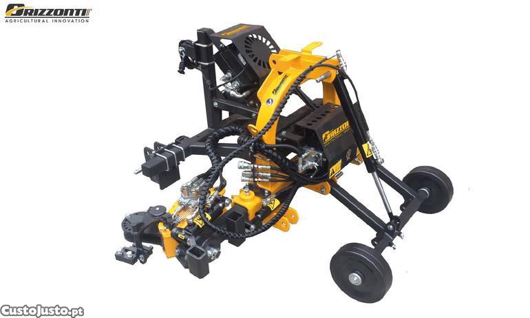 Intercepas Orizzonti Jolly, projetada para plantações de vinhedos e pomares com largura mínima de 220 cm. Acoplada ao trator por meio de engate de três pontos ou elevador hidráulico, ela vem de fábrica com um distribuidor eletro-hidráulico de 5 funções (4 + motores liga/desliga) para as seguintes operações: movimento lateral; inclinação e retração do cabeçote de trabalho; rodas dianteiras hidráulicas. Ajuste da altura de trabalho por meio de rodas dianteiras controladas por joystick.