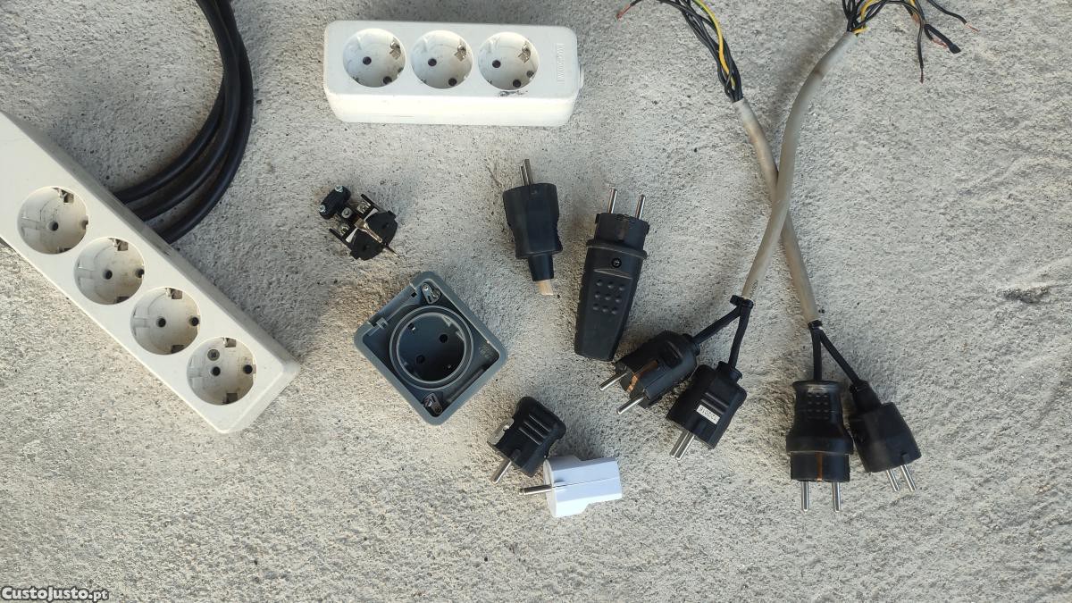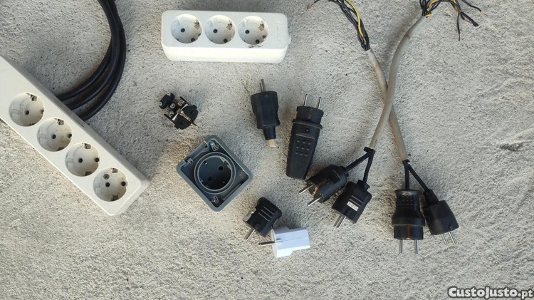 Vendo várias fichas Schuko monofásicas macho e femea e blocos de tomadas triplas.