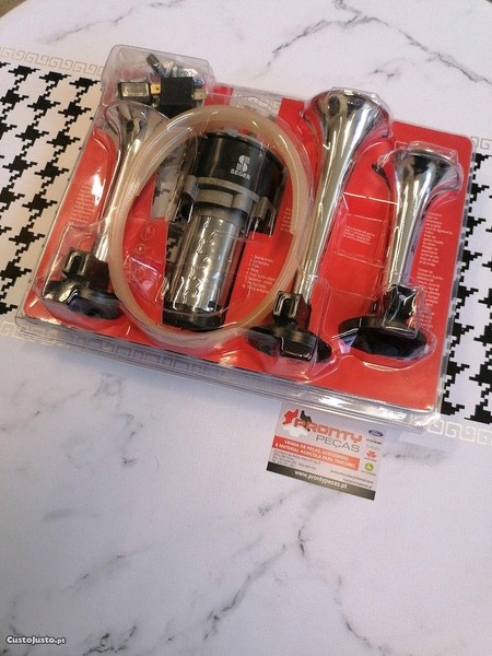 Jogo de buzina com compressor 3 cornetas cromadas, interruptor, relais e peças de fixação.