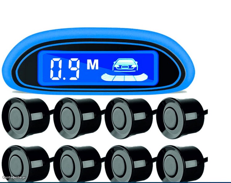 Kit constituído por 4 sensores, centralina, monitor com medição de distância, broca para furar a medida do sensor, cablagem e manual de montagem.